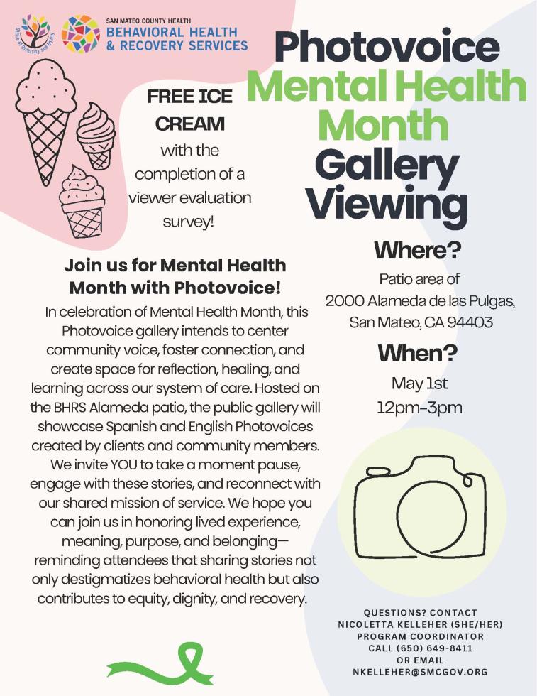 In celebration of Mental Health Month, this Photovoice gallery intends to center community voice, foster connection, and create space for reflection, healing, and learning across our system of care. Gallery will showcase Spanish and English Photovoices created by clients and community members. We invite YOU to take a moment pause, engage with these stories, and reconnect with our shared mission of service. Free ice cream will be offered! More info |