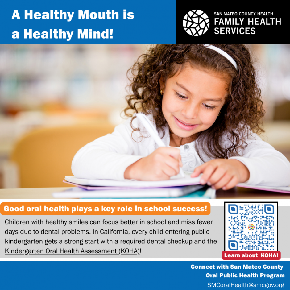 When children have good oral health and no infections in their mouths causing pain, they’re less likely to miss school days, or have problems learning or concentrating. This is why in the state of California, all children enrolling in public school kindergarten must have an oral health assessment completed by a dentist and turned into their school by the beginning of the kindergarten year. Learn more here.